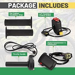 【PERFECT FIT】Compatible with dirt bike Surron Light Bee X(LBX)/ Surron Light Bee S(LBS). 【PACKAGE INCLUDED】1 * Throttle Handle w/ Rolling Bearing Kit (Throttle + Cable + Handle); 1 * Digital Speedometer & Dashboard Assembly; 1 * Left Handlebar Control Switch; 1 * Pair Rubber Handlebar Grips. 【PREMIUM PERFORMANCE】Smoother Throttle: Rolling bearing reduces friction for silky acceleration. Real-Time Data: HD display shows instant speed with zero delay. Safety Control: Brake kill switch instantly cuts power; integrated horn alerts pedestrians. Firm Grip: Textured rubber grips absorb shock & prevent slipping. 【EASY INSTALLATION】 Throttle & grips made of wear-resistant PA/rubber for long-term use. All components designed for direct, lossless replacement of OEM parts. 【ATTENTIVE SERVICE】If you have any questions before or after purchasing, please feel free to contact us. We work hard to manufacture high-quality products and also work hard to treat every customer with care. Thank you for your choice.