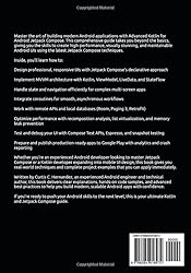 - Build Android apps that stand out with Kotlin and Jetpack Compose. This book is for developers who want to go beyond the basics and master modern Android UI development.You will learn:Advanced Kotlin features that make your code clean, safe, and expressiveHow to structure apps with MVVM, ViewModel, Coroutines, and StateFlowBest practices for managing state and building reactive, testable UIsNavigation patterns, animations, and custom layouts in Jetpack ComposeIntegrating Room, DataStore, Retrofit, and Paging 3 for real-world data handlingPerformance tuning, debugging, and optimization for production appsStep-by-step project: building a full Task Manager app with ComposeEach chapter focuses on practical techniques with code examples you can apply right away. Whether you’re preparing for a job, upgrading existing apps, or aiming to publish on Google Play, this book gives you the skills to deliver professional, modern Android apps.Who this book is forIntermediate to advanced Android developersKotlin developers ready to adopt Compose as their main UI toolkitProfessionals seeking clean architecture and scalable patterns for production appsTake your Android skills to the next level and build apps that are modern, maintainable, and ready for the future of Android development.