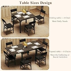 7-Piece Dining Table Set: This set comfortably seats 4-6 guests, which includes a foldable dining table, and 6 chairs. The woodgrain tabletop style and the black frame's clean lines make dining table a versatile addition to the kitchen, dormitory, living room, study room, office and meeting room. Extendable Dining Table for Flexible Space: The kitchen table can be flipped to extend when you need the extra space. Just 1 person can quickly extend the table without 10s that you can have a great time with your family and friends. Upgraded Upholstered Chairs: The kitchen table chairs set of 6 features soft fabric upholstered seats that exude comfort and elegance, creating a welcoming and inviting seating experience for the modern dining table. And the cushion chairs are more comfortable and ergonomic than other benches, which are crowded and uncomfortable. Space-Saving for Small Spaces: This dining table can be folded quickly when not in use. The chair can be gently Space-Saving for Small Spaces: This dining table can be folded quickly when not in use. The chair can be gently pushed into the area under the dining table, giving you more room to move around. Making this dining table set space-saving and perfect for small spaces. Table Size: 29.5"L x 31.5"W x 31.1"H(Folding); 59"L x 31.5"W x 30.3"H (Expand); Chair Size: 16.3"L x 14.1"W x 32.2"H. Sturdy & Durable: High-quality MDF board is used in this black dining table set, which is waterproof and scratch-resistant; it can be easily cleaned with a sponge and water. The sturdy steel frame and triangular structure provide strong support and stability for the dining table set for 6.