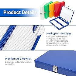 Keep Slides Safe & Organized: Holds 100 standard slides securely in individual slots—no more cluttering or cracked slides! Suitable for storing 1 inch x 3 inch(25 mm × 75 mm) microscope slides. Premium ABS Plastic: Rugged yet lightweight construction of our microscope slide storage box resists cracks and drop, ensuring long-term use. Space-Saving & Stackable: Compact design fits neatly on shelves, and the slide box can be stacked for efficient storage in labs, clinics, or home science kits. Convenient Storage: each slot of the microscope slide box is numbered and corresponds to the slide inventory table inside the lid,facilitating sample labeling, daily retrieval, and storage. Wide application: Our slide storage boxes are suitable for home specimen observation, laboratory analysis, school science education, biology, general training, and other activities. The microscope slide holders have become essential tools for professionals and amateurs alike.
