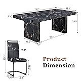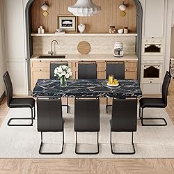 8-Person Black Dining Table Set:Measuring 79''Lx39.4''Wx30''H, this marble dining table set for 8 provides generous space for family meals or holiday gatherings. Whether you're hosting guests or enjoying a quiet dinner at home, everyone has room to relax and connect 3.5'' Thick Marble-Patterned Top:The standout feature of this black kitchen table set for 8 is its 3.5-inch thick tabletop with a high-end black marble grain finish. This marble surface with the round conor, adding an elegant statement and safe experience to the large kitchen table set Heavy-Duty Dining Room Table Set:Built to last, the wooden meterial and rectangular design provide strong support. The modern dining table set for 8 remains stable even during lively meals, while the metal-framed upholstered chairs offer reliable comfort and durability Easy-to-Clean Materials for Everyday Use:From accidental spills to daily crumbs, the smooth faux marble tabletop and wipeable faux leather upholstery make cleanup effortless. This marble dining table set for 8 with chairs is designed to stay fresh and stylish with minimal effort Quick Assembly with Clear Instructions:All tools and instructions are included for easy setup. To safely assemble this large and heavy kitchen table chairs set of 8, we recommend two people work together for a quick, hassle-free experience