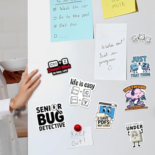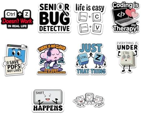 - FUNNY & RELATABLE DEVELOPER DESIGNS – Includes 10 unique coder-themed decals featuring hilarious lines like “Shift Happens” and “Ctrl + Z Doesn’t Work in Real Life.” Perfect for programmers, developers, engineers, and computer geeks.