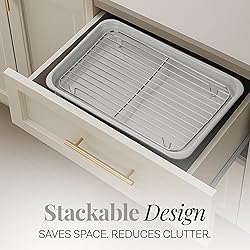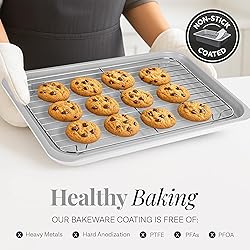 COMPLETE ESSENTIAL BAKING SET: Whether you're outfitting your first apartment or upgrading your home kitchen, this Gotham Steel bakeware set has the basics you need to bake, cook, and roast like a pro. Includes an XL cookie sheet, 12-cup muffin pan, full-sized square cake pan, loaf pan, deep roaster pan, and an air fry tray. It’s the ultimate starter kit or housewarming gift set for anyone looking for high-performance baking pans and oven-ready cookware — all backed by a 10-year guarantee. STACKABLE AND SPACE SAVING: Say goodbye to cluttered kitchen cabinets. This compact, stackable baking set nests neatly together, making it perfect for apartments, new homes, or smaller kitchens. Whether you're storing your cookie sheets, cake trays, or roasting pans, everything fits like a dream — the ideal bakeware solution for organized cooking spaces. NONSTICK, OIL FREE BAKING: Gotham Steel’s signature Ti-Cerama coating transforms the way you bake. With 3 layers of advanced nonstick technology, foods slide off effortlessly — no oils, butters, or sprays needed. This means healthier cooking, faster prep, and easier cleanups. No more scraping stuck-on cake, cookies, or oven dishes — these non-stick baking pans do the heavy lifting for you. MADE WITHOUT FOREVER CHEMICALS: Live life healthier with Gotham Steel. We strive to proivde our customers with the best nonstick performance without adding harmful chemicals. Each piece of bakeware is made without PFOA, PFOS, Lead, and Cadmium. DISHWASHER SAFE FOR EASY CLEANING: Cleanup should never feel like a chore. These non toxic bakeware essentials are dishwasher safe, so you can go from oven to sink to clean shelves without breaking a sweat. Spend less time scrubbing and more time enjoying your fresh-baked treats. HEAVY DUTY BAKEWARE: Crafted from 0.8mm thick aluminum, this durable bakeware set resists warping, heats evenly, and delivers perfectly baked dishes, time after time. Whether you’re using it as a daily baking set or part of your weekend cookware routine, this metal bakeware ensures long-lasting performance in any home or apartment kitchen.