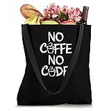 as a coffee lover and a programmer "no coffee no code" is your way of live. start slow in the morning with a hot cup of coffee before doing the computer stuff. 16” x 16” bag with two 14” long and 1” wide black cotton webbing strap handles. Made of a lightweight, spun polyester canvas-like fabric. All seams and stress points are double-stitched for durability, and the reinforced bottom flattens to fit more items and hold larger objects. Spot clean/dry clean only.