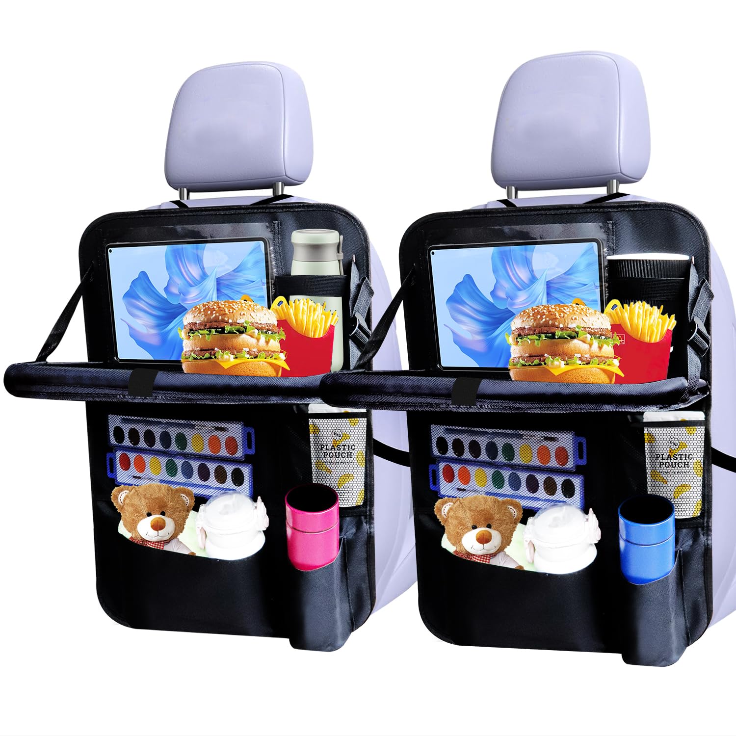 - Upgrade Car Tray: This car seat back storage unit features a fold-out tray that unfolds to provide a stable surface for laptop use or studying. When not in use, it secures flats with nylon clips to save space