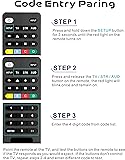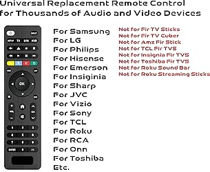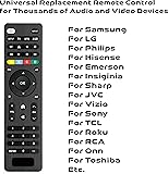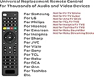 - Compatible Devices】Universal replacement remote control is compatible with TV brands for More Brand Smart TVs. Compatible with of devices, including DVD/Blu-ray players, Media Streaming Players and more! 【NOT Compatible Devices】Universal remote is Not compatible with Roku Streaming Sticks/ Roku Sound Bar/ AMZ Sound Bar/ TCL Sound Bar/ Hisense Sound Bar/ Anker Sound Bar/ Klipsch Sound Bar/ Fir TV Sticks/ TCL Fir TV/ Insignia Fir TV/ T/AMZ Fir Stick/ Fir TV Cube (This product can only be connected and paired via infrared) If you are unsure if our remote control is compatible with your device, please contact us. 【Simple Setup】Step 1: Find the device type you need in the code list. Then find and circle all the codes for the brand. Step 2: Press and hold down the (SETUP) button for 3 seconds until the red light on the remote turns on. Step 3: Press and release the (TV/STR/AUD) button on the remote, the red light will blink once and remain on. Step 4: Enter the first 4-digit code from code list. Step 5: Point the remote at the TV, and test the buttons on the remote to see if the TV responds as you would expect. If the buttons don't control the TV, repeat steps 2-4 and enter different code to test. Note:If all the code in the program fails, please check the instructions on page 7 "Automatic Code Search. 【Package Included】Package includes 1* Remote Control, 1* User Manual, and 1* Code list. The universal remote control is to use 2 * AAA batteries(Batteries are not included). Note: Please do not mix old and new batteries or mix different batteries together.