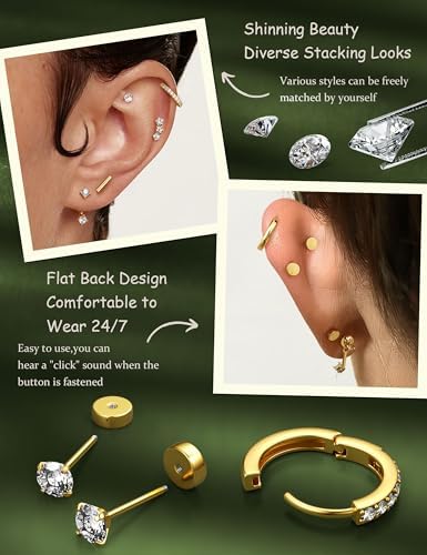 Hypoallergenic Stud Hoop Silver 14K Gold Plated Earrings Stacks - 9 Pairs Surgical Stainless Steel Earring Set for Sensitive Ears - Small Ear Piercing Flat Back Cartilage Earrings for Women Trendy Gifts