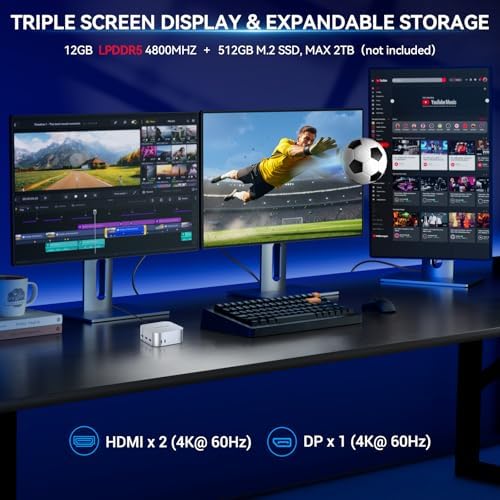- 【UBUNTU LINUX MINI PC & Expandable Storage】The pc mini is specifically designed to run the Linux Ubuntu operating system flawlessly, providing a secure and highly customizable computing experience. It can meet your different needs for those who prefer the flexibility and power of Linux. Equipped with high-speed 12GB LPDDR5 RAM (4800MHz) and 512GB SSD, offering faster reading speed and lower power consumption than DDR4. You can replace the SSD to max 2TB (not included) to expand the storage