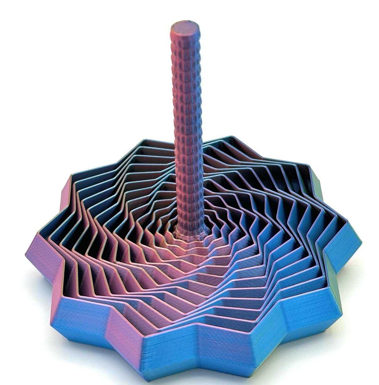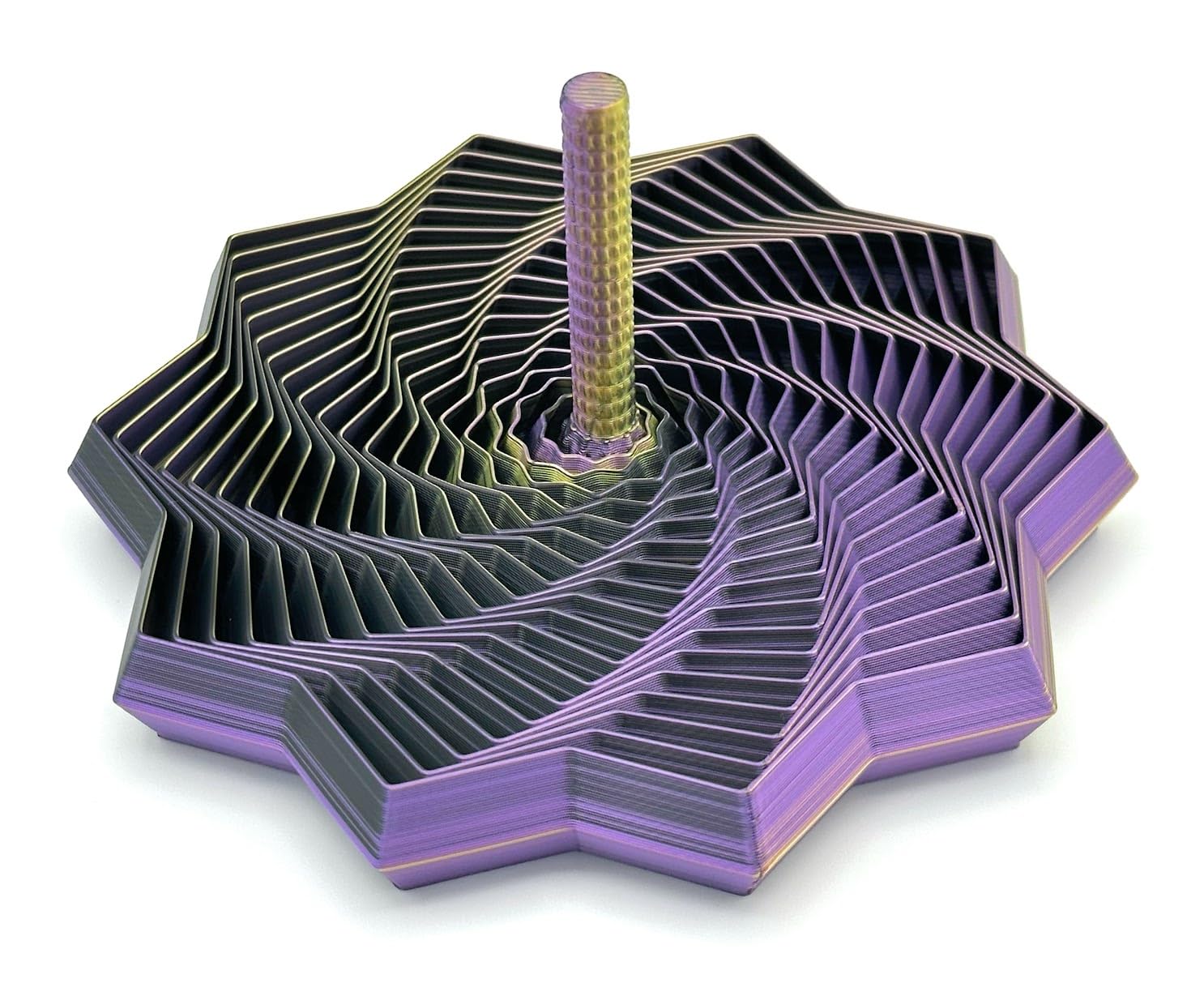 - Expanded Sensory Fidget Star with Handle – Visually Captivating and Satisfyingly Noisy! Experience a mesmerizing blend of motion, sound, and color with this 3D-printed Sensory Fidget Star. Designed for visual and auditory stimulation, this star expands and contracts with a satisfying clicking sound and creates dynamic patterns with every movement. Made from high-quality three-color Silk PLA, each piece features a swirl of vibrant, glossy colors that shimmer and shift as it moves. The built-in handle makes it easy to spin, flip, and fan the star open, offering a full sensory experience that's fun to watch and hear. Available in five sizes to suit all preferences: Small – 14 rings, approximately 3.25 inches in diameter Medium – 20 rings, approximately 4.5 inches in diameter Large – 26 rings, approximately 7 inches in diameter Extra-Large - 26 rings, approximately 10 inches in diameter Giant - 26 rings, approximately 12.75 inches in diameter Combo - Combo Pack with a Small, Medium and Large Choose from 5 stunning color combinations: Black - Gold - Purple Orange - Blue - Green Red - Yellow - Blue Red - Yellow - Green It's called Green but this one is more of a turquise Blue - Green - Purple Or select Random for a surprise which may be one of the colors above, a cool prototype color or even a combination of colors with stripes! Whether you're fidgeting for focus, relaxation, or fun, this star offers engaging sensory feedback and eye-catching motion. Made from glossy and colorful three-color Silk PLA filament Produces captivating clicking sounds and stunning visual effects when spun or expanded Integrated handle allows easy movement and display Not suitable for children under 5 – contains small parts and moving elements Based on a design by webbdavi Add a splash of color, sound, and motion to your day with this unique sensory fidget star!