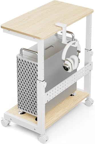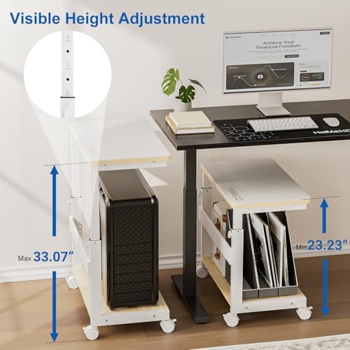 Height Adjustable Computer Tower Stand, 2-Tier ATX-Case CPU Holder with Mouse Pad & Headphone Stand, Mobile PC Standing Under Desk, Home Office Gaming Accessories, Computer Cart Wheels, Maple