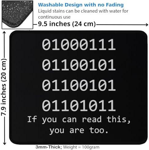 Show off your tech-savvy side with this clever binary code mousepad featuring the message 'If you can read this, you are too' encoded in binary. Perfect for programmers, developers, and computer enthusiasts, this black gaming mousepad combines style with functionality. Measuring 9.5 x 7.9 inches with a 3mm thickness, it provides ample space for smooth mouse movement. The dense anti-slip rubber base keeps the pad firmly in place during intense coding sessions or gaming marathons. Built with durability in mind, this mousepad features reinforced edges to prevent fraying and a washable surface that resists staining - simply clean with water when needed. At 100 grams, it's substantial enough to stay put while remaining portable. The crisp white binary text on the black background creates a sleek, minimalist aesthetic that will complement any desk setup while showing off your coding credentials.