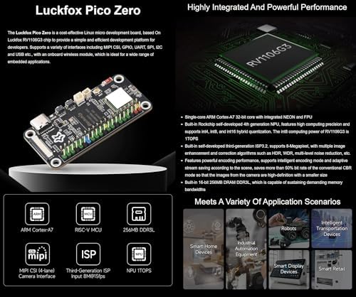 The Luckfox Pico Zero is a cost-effective Linux micro development board, based On Luckfox RV1106G3 chip to provide a simple and efficient development platform for developers. Supports a variety of interfaces including MIPI CSI, GPIO, UART, SPI, I2C and USB etc., with an onboard wireless module, which is ideal for a wide range of embedded applications. Features ● Single-core ARM Cortex-A7 32-bit core with integrated NEON and FPU. ● Built-in Rockchip self-developed 4th generation NPU, features high computing precision and supports int4, int8, and int16 hybrid quantization. The int8 computing power of RV1106G3 is 1TOPS. ● Built-in self-developed third-generation ISP3.2, supports 8-Megapixel, with multiple image enhancement and correction algorithms such as HDR, WDR, multi-level noise reduction, etc. ● Features powerful encoding performance, supports intelligent encoding mode and adaptive stream saving according to the scene, saves more than 50% bit rate of the conventional CBR mode so that the images from the camera are high-definition with a smaller size. ● Built-in 16-bit 256MB DRAM DDR3L, which is capable of sustaining demanding memory bandwidths. Package Content 1. Luckfox Pico Zero x1