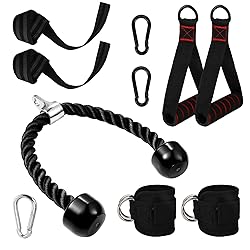 - Upgrade your workouts with this complete Cable Machine Attachment Set, designed to target every major muscle group. The set includes ankle straps, a tricep rope, gym exercise handles, lifting wrist straps, carabiners, and a storage bag, giving you everything you need for a versatile strength training routine. The ankle straps for cable machines provide secure support for glute kickbacks, leg curls, and lower body exercises. The tricep rope attachment is made of heavy-duty nylon with rubber ends for a strong grip, perfect for pushdowns, curls, and face pulls. The exercise handles are padded with thick foam for comfort and control during chest, back, and shoulder workouts. Plus, the included lifting wrist straps help you maintain grip during heavy lifts like deadlifts and rows, reducing strain and boosting performance. Whether you’re training at home or in the gym, this durable cable machine attachment set ensures maximum versatility and value. Add variety to your workouts, improve muscle activation, and achieve your fitness goals with this all-in-one gym accessory kit.
