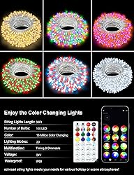 Warm Tips: The string lights are powered by USB, have no tail plug, and cannot be connected in series. Smart String Lights: 33 Feet 100 Vibrant RGB color changing IC LEDs, each LED emits brilliant colors, adding a festive glow to any space. Perfect length for wrapping around trees, staircases, and more. Endless Color Combinations: With RGB color changing IC technology, you can create endless color combinations, from subtle gradients to bold contrasts, to suit any occasion or mood. Smartphone App Control: Take command of your lights with ease using our intuitive smartphone app. Adjust colors, brightness, and effects with just a few taps on your phone. Remote Control Convenience: For those times when you prefer a tactile experience, the included remote control offers convenient access to all lighting features from the palm of your hand. Music Synchronization: Elevate your gatherings with music synchronization, as the lights pulse and dance in harmony with your favorite tunes, creating an immersive audio-visual experience. Durable and Versatile: Designed for both indoor and outdoor use, these lights are waterproof and built to withstand the elements, making them perfect for any environment or occasion.