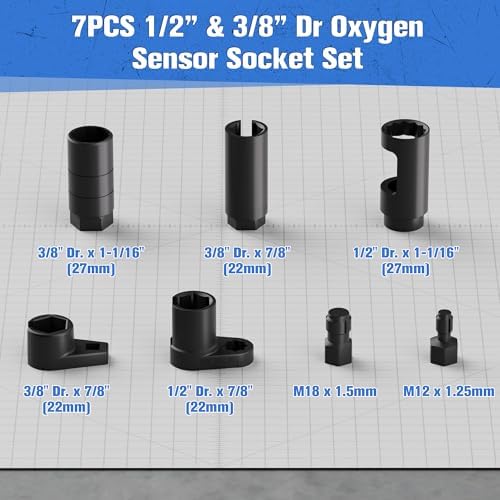 - INCLUDES: The master sensor socket set includes seven versatile sockets: 1PC 1/2" Dr. x 7/8" (22mm) offset oxygen sensor socket, 1PC 3/8" Dr. x 7/8" (22mm) offset oxygen sensor socket, 1PC 3/8" Dr. x 7/8" (22mm) oxygen sensor socket, 1PC 3/8" Dr. x 1-1/16"(27mm) thermal sensor switch socket, 1PC 3/8" Dr. x 1-1/16"(27mm) oil pressure sensor socket, 1PC M12 x 1.25mm thread chaser and 1PC M18 x 1.5mm thread chaser