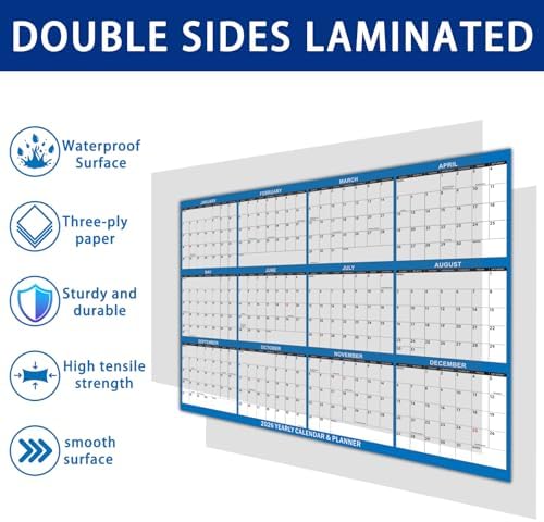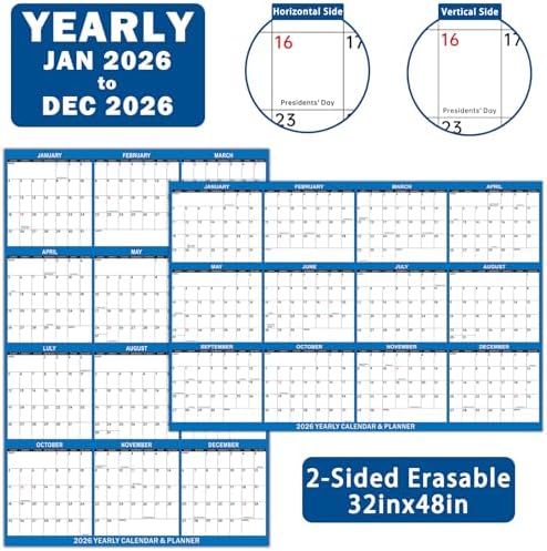 - Extra large size and double-sided design: 32x48 inches extra large dry erase calendar, covering 12 months of 2026, double-sided usable: one side is vertical layout, the other side is horizontal layout for easy monthly planning, meeting various usage needs