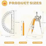 Value Compass Geometry Tool Set: you will receive 30 pack geometry compass set, including 15 pieces of math compass with pencils and 15 pieces of geometric protractors, enough to meet your different work or study needs, and share with family or friends High Quality Material: the compass for geometry is made of high-quality metal, sturdy and durable, the tip of the compass is sharp and hard, and can be accurately marked and drawn (note: be careful with the tip when using); The clear protractor is made of high-quality plastic, with clear scales, sturdy and durable, the transparent design allows you to see the content of the page, helping you to measure easily Appropriate Size: each metal compass is 5.1 inches long and can draw a circle with a diameter of up to 11 inches, or various circles can be drawn as needed; The plastic protractor has a diameter of 6 inches and a range of 0-180 degrees; These math compass and protractor set are ideal for school projects, mathematical geometry, and artistic architectural drawing, helping you quickly complete your work Practical Design: our compass geometry tool boasts movable arms for improved accuracy, while the non-slip backing provides added stability when drawing smooth lines. Our product is thoughtfully designed with practicality and comfort in mind, giving you a good sense of use Widely Used: this exquisite compass drawing tool is widely used in various fields, including mathematics, engineering, carpentry, arts, and drawing. Whether you're a student, teachers, architects, engineers, mathematicians, artists, or a designers, this practical and multifunctional set helps you get the job done quickly and easily