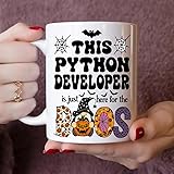 - Celebrate Halloween with spooky charm and daily coffee bliss! Our 11oz white ceramic mug features a fun Here for the Boos design, perfect for any Python Developer who loves coffee, tea, or hot cocoa. With pumpkins, bats, spiderwebs, and festive colors, it’s a seasonal favorite for fall drinkware lovers. Perfect for Everyday Use – Made from durable ceramic that’s dishwasher safe and microwave safe, this mug makes busy mornings, work breaks, and cozy evenings effortless. Great Gift for Any Python Developer – Whether it’s a coworker, friend, or family member, this Halloween Python Developer coffee mug is a thoughtful and practical gift for school events, office parties, or autumn gatherings. More Than Just a Mug – Use it as a pen holder, desk accessory, or festive home decoration to bring Halloween cheer to any space. Bring a smile to your favorite Python Developer this Halloween with a mug that’s as fun as it is functional!