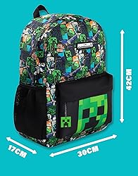 OFFICIALLY LICENSED MINECRAFT BACKPACK This Minecraft Steve & Creeper Multicolour Backpack is an officially licensed collaboration, ideal for young fans of the renowned game, ensuring authenticity and quality in every detail. VIBRANT GRAPHIC DESIGN Featuring a striking graphic print of popular characters like Steve and Creeper on a black background, this backpack ensures children stand out at school or during activities, making it a fun accessory for daily use. DURABLE POLYESTER CONSTRUCTION Made from 100% polyester, this backpack guarantees durability and a regular fit, along with a zip-up closure that keeps belongings secure, making it suitable for various occasions like World Book Day or class trips. UNISEX KIDS DESIGN Tailored for unisex kids, this backpack caters to both boys and girls aged 5 to 12, allowing them to express their passion for Minecraft while conveniently carrying their books and supplies. MULTIFUNCTIONAL USE Constructed for flexibility, this backpack is perfect for school, travel, or playdates, featuring a spacious main compartment to accommodate books, stationery, and other essentials comfortably.