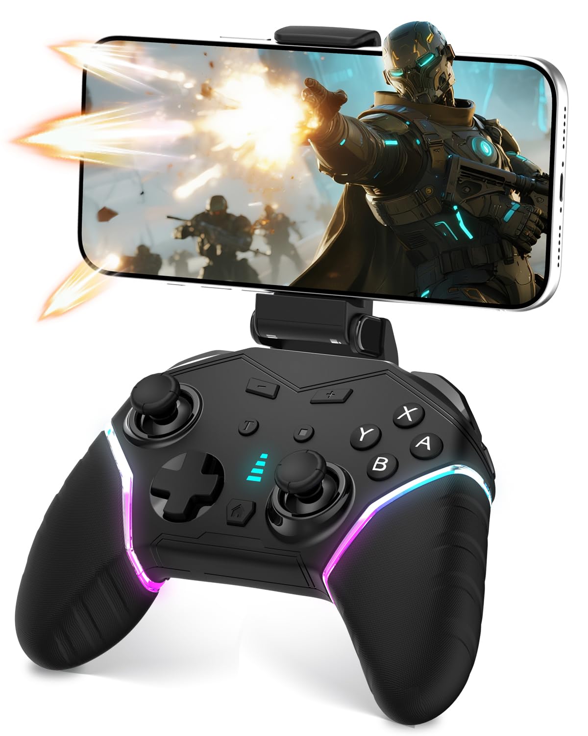 Wireless Mobile Game Controller for iPhone/iOS/Android/Switch/Laptop, Wired for PC/Steam, Cell Phone Controller Gamepad with Programmable, Turbo, Vibration, 6-Axis Gyro&RGB Lights(Phone Clip Included)