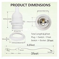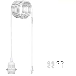 With a length of 20 feet, this cable suits most hanging light setups. Compatible with standard E26 sockets and features an ON/OFF toggle switch. Supports a maximum wattage of 360W within the voltage range of 120V-250V. It's simple to install the bulb without any tools. Control option which you can turn on and off easily just simply press the button on the cable. We prepare 3 ceiling hooks and 3 cord hooks for hanging. Easily toggle the lights with a push-button switch located 1.65ft from the plug, ensuring effortless operation. Compatible with A Variety of E26/E27 Bulbs: Universal lamp holder for standard E26/E27 bulbs, suitable for LED bulbs, incandescent bulbs and CFL bulbs( Bulb NOT Included). Versatile and Multi-scenario: Suitable for many occasions, such as bedroom, living room, kitchen, office, patio, outdoor garden, backyard, barn, garages, deck, basement, etc.