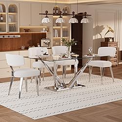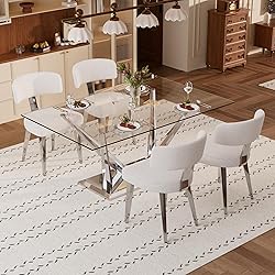 【Modern Glass Dining Table Set】Modern 5-piece rectangular glass dining table set with 4 boucle chairs. Its sleek minimalist design and opulent style complement various decor styles, adding subtle luxury to your space. 【63" Glass Dining Table】8mm tempered glass top, scratch-resistant. Sturdy stainless steel support base prevents wobbling, holds up to 250 lbs. Durable and stable. 【Comfortable Boucle Dining Chairs】Plush boucle dining chairs with thick cushion for comfort. Metal Legs support system of high-resilience foam cushion ensures lasting shape and comfort for every meal. 【Multi-Functional Glass Dining Room Table Set】Versatile clear table set with a modern design. Its spacious surface is perfect for dining and entertaining, effortlessly adapting to your kitchen, dining, or living room. 【Warm Customer Service】In order to simplify shipping, this kit is shipped in multiple packages, the actual time of package arrival may not be consistent, please be patient. Installation instructions and parts are included in the package, if you have any questions, don't worry to ask us, we will answer you as fast as possible.