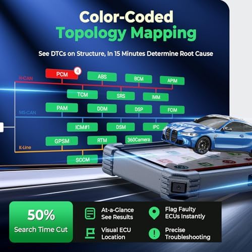 • 【Topology Mapping, One-Touch Diagnostics】 The X431 PRO3 V+ Elite bidirectional scanner now offers an easy-to-read topology map that shows your vehicle’s complete system layout. It can test multiple systems at once, display color-coded status telling you how many control modules are available, what’s being scanned, and what the test results are, so you can spot problems at a glance, cutting more than 15 minutes off every diagnosis.