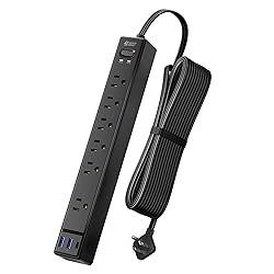 9 IN 1 Surge Protector Power Strip: Features 6 AC outlets, 2 USB-A port, and 1 USB-C ports to give everything you need to power up all of your electrical appliances. Designed with extra space (2 inch) between outlets to accommodate even the largest plugs. Flat Long Extension Cord 10 ft: With an ultra thin flat head (only 0.35 inches) design, our flat plug power strip can easily fit in tight spaces and hidden behind furniture; The 45° right angle plug creates extra space for other receptacles below without blocking. 8-Point Safety Protection System: Combines 1050 Joules surge protection, 1250W overload protection, 10A over-current protection, 1382℉ fire retarding, and more to protect your electronics, providing you a safe and reliable indoor charging environment. Power Strip with USB: 2 USB-A (5V/2.4A) and 1 USB-C (5V/3A), with a total USB output up to 15W. This USB charging station can auto-detect charged devices’ power draw and deliver optimal charging speed. Wall Mountable Power Strip: 2 mounting holes on the back enable this outlet extender for secure wall / desk installation. The space-saving compact design, optimized for apartment / college dorm room / home office use with UL-recognized cable and V-0 fire-retardant casing.