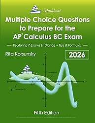 - Multiple Choice Questions to Prepare for the AP® Calculus BC Exam (5th Edition) is your essential tool for scoring well on the AP® Calculus BC Exam.This updated edition reflects the latest AP® Calculus BC curriculum and exam format, ensuring you’re fully prepared for the 2026 AP® Exam.The author, Rita Korsunsky, is an award-winning AP® Calculus teacher whose students’ scores on the AP® Exam are: 100% passing and 94% earning a 5.This book includes:Seven full-length multiple-choice exams (a total of 315 problems) in the exact format of the AP® Exam • Section I Part A: 30 multiple-choice questions without a calculator. • Section I Part B: 15 multiple-choice questions with a graphing calculator allowed.One of them is a digital-format exam, so you can practice answering questions online and get comfortable with the testing environment.A reference collection of formulas and theorems carefully chosen and organized for quick access.Tips for the AP® Test to help you avoid common mistakes and misconceptions.An Answer Key with multiple-choice answers for all practice questions. Please note: Detailed step-by-step solutions to each of the 315 problems in the book (in PowerPoint format) can be ordered separately at www.Mathboat.com. Why this book works:This book is designed with the student in mind. It reinforces key skills such as attention to detail, reviews all major problem types, and provides the optimal number of practice questions. By working through these exams, you will:Identify strengths and weaknesses.Build confidence through targeted practice.Improve problem-solving and time-management skills.The practice tests in this book are modeled after the real AP® Exam in format, style, difficulty, and variety, giving you the closest experience to the actual test.Proven success:This book has already helped thousands of students across the U.S. succeed on the AP® Calculus BC Exam.For even greater success, pair this workbook with Mathboat’s AP® Calculus BC Lecture Notes (also available on Amazon). These lecture notes contain all the theorems, proofs, examples, and memorization techniques needed for a rigorous understanding of the entire AP® Calculus BC curriculum. They are perfect for both review and learning, and an indispensable companion to this workbook.Get ready to boost your score, master key concepts, and walk into your AP® Calculus BC Exam with confidence!