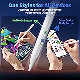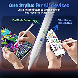 Wide Compatibility: This stylus pen features a unique design that supports both iOS and Android systems. "iPad Mode" of stylus pen is compatible with the Apple iPad series 2018-2025 models: iPad Pro 13 inch (M4), iPad Pro 11 inch(all versions), iPad 11/10/9/8/7/6th Gen, iPad Air 3rd/4th/5th/M2/M3 Gen, iPad Pro12.9 inches 3/4/5/6th Gen, iPad Mini 5th/6th Gen. NOT compatible iPad models 2017 and before. Upgraded Universal Touchscreens:"Other Device Mode" of stylus pen is for Apple iPhone series (iPhone 6+ /iOS devices), Apple Watch series, Android phones and tablets. NOT compatible with Fire HD, Kindle, Pixel, or Chromebook and other Electromagnetic Screen. High Precise and Sensitive: Stylus Pen has premium 1.5 mm nib with highly sensitive touch technology. It provides better accuracy and smooth writing without lag, delays and disconnections, boasting strong compatibility—perfectly meeting the high-precision creative needs of universal touchscreens devices users Palm Rejection & Magnetic Attachment : When the stylus is in iPad mode (displays a green light), the Palm rejection technology enables your palm to rest comfortably to ensure a smooth and natural experience. Equipped with dual magnets design that securely attach to iPad, eliminating worries about rolling and lost. 15 Mins Fast Charge & Ultra-long Battery Life: Stylus pen features Type-C charging, it fully charged in just 15 minutes and provides up to 10 hours of continuous use to meet extended working needs. Multi-Function Indicator & Controls: Green (iPad Mode ), Blue (Other Touchscreen Mode ), Red (<5% power). Short-press either button to power on. Clear indicator lights display the pen's current mode and battery consumption status, allowing you to work with ease and convenience without battery anxiety. How to Use:This pencil does not require a Bluetooth connection. Simply press the button on the top of the stylus to turn it on. Long-press 3s to shut down. Auto-sleep after 5 minutes. The upward/downward buttons of the pen can be used to switch freely between the two modes(iPad mode & Other Device Mode) Perfect Gift: To exploring new designs and features, Perfect Christmas gifts for artists, students, educators, business professionals, and everyday users. Package contents: 1 Stylus Pen, 3 Stylus replacement tips, 1 Type-C Cable, and 1 User Manual.