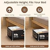 360° Smooth-Rolling Under Bed Storag: This upgraded underbed storage bin features 360° swivel wheels with a set of 10 ball-bearing casters for effortless gliding. With a strong (up to 70 lbs)load capacity, it slides smoothly on hardwood floors, tile, and even carpet. The adjustable 7.8–11 inch height fits both high dorm beds and standard bed frames, making storage access quick and convenient. Durable Sturdy, Large Capacity: Built with a reinforced metal or hardwood frame and durable Oxford fabric, under bed storage with wheels stays sturdy and keeps its shape over time. A center Velcro strap adds stability, and the bottom frame can be used separately. The 90L XXL capacity is ideal for bedrooms, closets, dorms, and under the sofa—perfect for storing shoes, seasonal clothing, bedding, and daily essentials. No Assembly Needed & Flexible Use: Designed for stress-free use, this rolling storage bins with wheelsrequires virtually no assembly—just unfold and start organizing. Keep the wheels on for easy pull-out storage or remove them when placing the bin inside a closet or stationary space. Clear Window, Dual Zippers & Easy Access: The clear front window lets you see what’s inside at a glance without opening multiple underbed storage containers. The upgraded stainless steel dual zippers glide smoothly for quick access, while the side leather handles provide a comfortable grip and make it easy to pull out or move the storage bin anywhere you need. Breathable Fabric & Dust Protection: Made with thick, breathable Oxford fabric and a sturdy frame, these under bed storage with wheels protect your items from dust, moisture, and everyday wear. Ideal for long-term storage of clothes, bedding, and other essentials, they offer a cleaner, more hygienic solution than open underbed drawers. When not in use, they fold flat for easy storage.