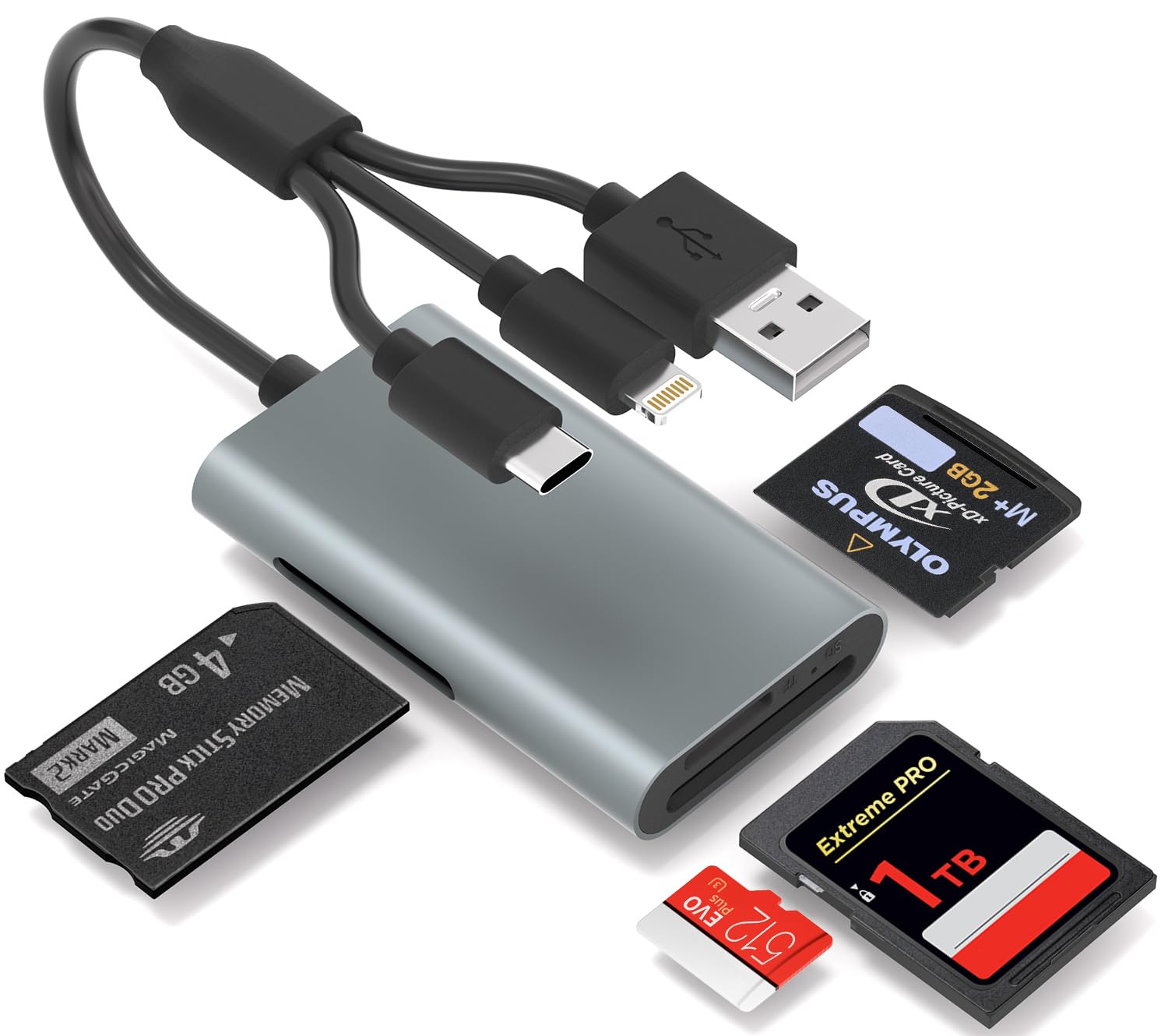 Memory Stick Pro Duo Adapter - 4 in 1 Memory Card Reader for SD/Micro SD/MS/xD-Picture-Card, SD Card Reader for iPhone 17/16/15/14/Android/PC with Lightning/USB-C/USB-A Port Digital Camera Adapter