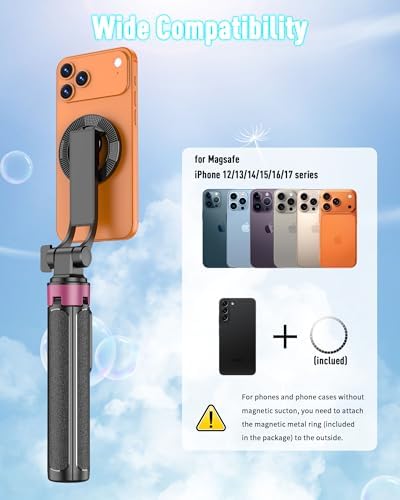 - 【Wide Compatibility】Cell phone tripod is fully compatible for iPhone 17/16/15/14/13 Pro Max All Phone Series and Mag-Safe Cases. Travel tripod the included magnetic metal ring, delivering a secure and stable like experience for your devices