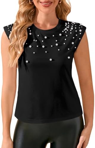 Women's Pearl Beaded Top Sleeveless Shoulder Pad Casual Tee T-Shirt Summer Outfits 2025