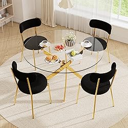 [Modren Round Table with Chairs] This circle dining table set includes one beautifully designed round table and four boucle chairs, perfect for fostering engaging discussions with family and friends in a cozy atmosphere. The dining table features a tempered glass tabletop supported by four intersecting metal legs, ensuring sufficient sturdiness and durability to support up to 300 lbs. Compared to square designs, the round tempered glass tabletop offers enhanced safety and accommodates more items within the same footprint, making it the perfect choice for apartments. [Comfortable Dining Chairs] Our kitchen dinner chair combines a generous thick round cushion, filled with high-density sponge, and a spacious 18.3''x 18.3'' seat for exceptional comfort. The elegantly curved backrest supports your back while you eat or relax, featuring a rearward sloping curve that meets [Wide Use] The clever design allows you to tuck the chairs under the table when not in use, maximizing your space for decorative items, snacks, or utensils. This round dining table with chairs is ideal for various settings, including dining rooms, kitchens, or casual meeting areas. [Quick Assembly & Maintenance] Assembling this round breakfast table set is straightforward, thanks to clear, concise instructions included in the package. Plus, maintenance is a cinch—simply wipe down the surfaces with a damp cloth to keep them looking new.