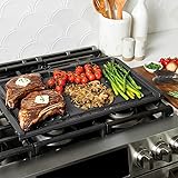 - Take your stovetop cooking to the next level with the Basalt Dual Top Grill Griddle — a versatile, family-sized powerhouse designed for breakfast, lunch, and dinner. Featuring both a ridged grill zone and a smooth griddle surface, it lets you cook multiple foods at once — from sizzling proteins and seared veggies to perfectly fried eggs, hashbrowns, or toasted buns. Spanning two burners, this griddle offers maximum cooking capacity, making it easy to prepare meals for the whole family all on one pan. Built with durability and performance in mind, the Basalt Dual Top Grill Griddle boasts a two-layer ceramic nonstick coating. High sides help contain splatters, while a sloped surface and drip lip efficiently drain away excess oils and juices for healthier results. Crafted from cast aluminum, it heats evenly for consistent browning and searing. Compatible with gas, electric, and ceramic stovetops — and oven and grill safe up to 475°F — it’s your go-to solution for everything from hearty breakfasts to grilled dinners. Exterior measurement of 20.2x 12.3 x 1 inches, the full dual cooking surfaces measure 18.8 x 10.3 inches. More details on griddle size and cooking surface dimensions are displayed in the dimensional drawing. Made in America of domestic and imported materials.
