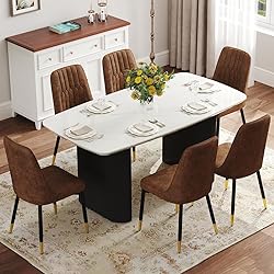 Spacious Modern Dining Table Set: With its 67'' x 35.4'' oval-shaped tabletop, this marble dining table set with metal chairs comfortably seats 6 people, optimizing dining space for everyday meals, family gatherings, or holiday celebrations Thick and Durable 3.5'' Top: Built with a 3.5'' thick tabletop, this white dining table set for 6 resists bending and wobbling. The rounded corners add safety, making the modern dining table set a family-friendly option for households with kids Reliable Support and Everyday Durability: Crafted from premium wood and metal, the table supports up to 300 lbs of meals and décor, while each chair holds up to 250 lbs. Even when kids move around or climb on it, the modern dining table set for 6 remains steady and safe. Easy to Clean and Assemble: The smooth, seamless tabletop resists stains and scratches, while the faux leather chairs are easy to wipe clean after daily use. This modern dining table and chairs includes clear instructions and all necessary tools, allowing for quick assembly in just 30 minutes Modern White Marble Design: The sleek white marble-patterned surface paired with a balck Roman column base and 6 metal-legged chairs, creates a modern aesthetic. This 7 piece dining table set is perfect for cozy family meals and can also suit a more formal dining or meeting space