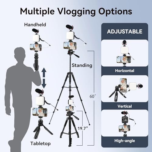 Vlogging Kit for iPhone, Android, YouTube Starter kit Content Creator Equipment with 60'' Extendable Fullsize Tripod, Soft Light and Shotgun Microphone for Vlogging, YouTube, TikTok