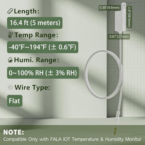 External Flat Temperature & Humidity Sensor Probe – Waterproof, (-40°F to 194°F, 0 to 100% RH), 16.4ft Length for Greenhouse, Farm, Freezer & Industrial Use, Only for FALA IOT Detector