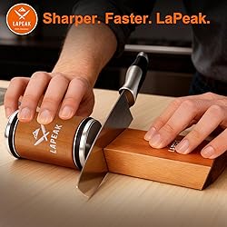 Precision Edge, Effortless Sharpness : Keep your knives cutting like new with LaPeak’s rolling knife sharpener. Engineered for precision and longevity, this manual sharpener restores a razor-sharp edge in minutes—no skill required. Perfect for chefs, home cooks, and outdoor enthusiasts. Dual Diamond & Ceramic Discs : Crafted with industrial-grade #400 diamond and #3000 ceramic discs, our sharpener effortlessly reshapes and polishes blades of any hardness. The diamond disc removes dull metal layers, while the ceramic side hones to a mirror finish for clean, smooth cuts. 15° & 20° Magnetic Angle Guides: Achieve factory-perfect consistency every time. Two built-in magnetic angle options—15° for fine slicing knives and 20° for everyday kitchen blades—ensure a precise, uniform edge across the entire blade surface. Premium Wood Base with Strong Magnets: Built from high-grade natural wood with four N42 neodymium magnets, the LaPeak sharpener holds your knife securely in place. Designed for stability, balance, and a touch of craftsmanship that elevates your kitchen counter. Gift-Ready Design & Reliable Service: Packaged in a premium gift box, the LaPeak knife sharpener makes an exceptional gift for chefs, dad, mom or anyone passionate about cooking. We stand behind our quality—contact us anytime for professional after-sales support.
