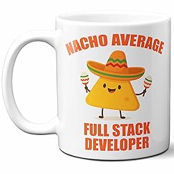 - The ideal funny gift for any Full Stack Developer! Perfect for coffee, tea, latte or any other hot or cold beverage, this awesome 11 ounce mug features a large, comfortable handle, is made from high quality, dishwasher & microwave safe ceramic which means that the graphics will never fade even after thousands of uses. Mug Reads: "Nacho Average Full Stack Developer."
