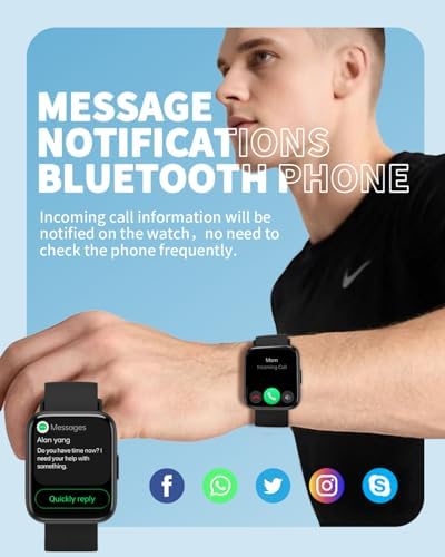 - 🎄 Bluetooth Call & Smart Reminder: Smart watch is equipped with an advanced 5.3 chip, allow you to make Bluetooth calls, sync contact information and store call history. Also can send vibrating alerts for messages and various social media notifications.Simply lift your wrist to view the information.You can also "Quick Reply"(note: Android only,keywords reply template) the message via your smart watch.