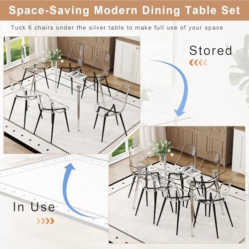 Ebullient Glass Dining Table Set for 6, 51'' Modern Dining Table Set with 6 Clear Acrylic Chairs, Tempered Glass Top and Black Metal Legs, Compact Kitchen Table Set for Small Space