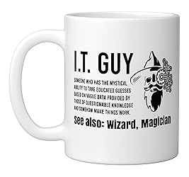 Funny design. Funny tech wizard / computer wizard design. 11-ounce ceramic mug is dishwasher and microwave-safe, lead and BPA free Features glossy finish with accent colors on interior, handle, and rim of two-tone designs