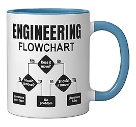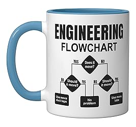 This hilarious engineer flowchart shows the universal logic of duct tape and lube. Perfect for tech lovers, fixers, mechanics and creative problem solvers. Great for engineers, DIY fans or nerds who appreciate clever solutions and sarcastic humor. Makes every mechanical failure a laughing matter. 11-ounce ceramic mug is dishwasher and microwave-safe, lead and BPA free Features glossy finish with accent colors on interior, handle, and rim of two-tone designs