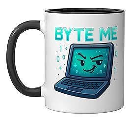 Playful cartoon computer illustration with smirk, digital sparks, and floating binary numbers, paired with bold tech-style lettering saying “Byte Me,” perfect for programmers, tech lovers, digital humor fans, coding enthusiasts, software humor, geeks. Bold, clean vector cartoon computer with exaggerated features, accent sparks, fun tech humor, playful anthropomorphized laptop design. Perfect for casual, digital humor, tech lovers, coding lifestyle, programmer culture, geek humor, tech illustration. 11-ounce ceramic mug is dishwasher and microwave-safe, lead and BPA free Features glossy finish with accent colors on interior, handle, and rim of two-tone designs