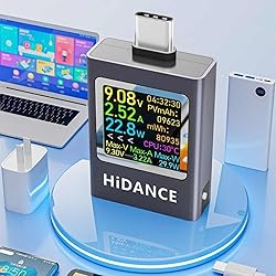 High Precision USB C Power Meter Tester: This USB C tester voltage current tester can measure voltage, current, power, capacity, energy, timing, temperature, and record the maximum voltage, current and power values. It has the same accuracy as large professional instruments. Support Testing of Almost All Type-C Protocols: This USB C cable tester supports fast charge test for PD2.0, PD3.0, PD3.1, PPD, QC2.0, QC3.0, FCP, SCPAFC, PE, DASH VOOC, SuperVOOC, etc. It can measure the voltage up to 50V of PD3.1 protocol. Supports two-way measurement. You can easily check the charging status and speed of your devices. 6 Display Modes and 360 Degrees Rotation: This USB C meter has a high-definition color screen, which can display 6 interfaces. You can switch modes with the button. The screen can also rotate 360°, which is convenient for viewing from different angles. Offline Storage and Battery Capacity Detection: This USB multimeter can store the data when it is offline, and you can view the historical data when it is online. It can also detect the capacity of power banks and various types of batteries. You can use it to test the performance and health of your batteries and chargers. Auto Screen Off and Wide Compatibility: This USB C watt meter can automatically turn off the screen when there is no current, which can save power and extend the service life. It is compatible with various devices with Type-C port, such as laptops, tablets, phones, power banks, chargers, etc. It is a must-have tool for testing and monitoring your devices.