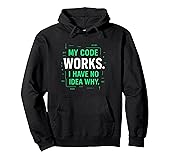 My Code Works I Have No Idea Why Apparel: Ideal computer science apparel for a programmer, software developer, or coding student who loves debugging humor and nerd geek jokes. Funny Programming Humor: This coder outfit is perfect for men and women on Christmas, Birthday, or graduation. It features a minimalist tech design with vibrant green code. 8.5 oz, Classic fit, Twill-taped neck