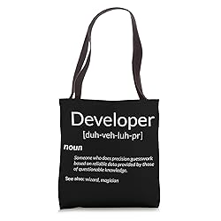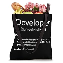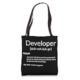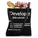 Developer Dictionary Definition Funny developers design ideal for programmers and coders 16” x 16” bag with two 14” long and 1” wide black cotton webbing strap handles. Made of a lightweight, spun polyester canvas-like fabric. All seams and stress points are double-stitched for durability, and the reinforced bottom flattens to fit more items and hold larger objects. Spot clean/dry clean only.