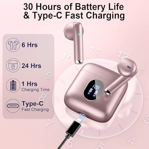 - Extended 30H Playtime and LED Power Display: A single charge of the wireless earbuds bluetooth provides 6-8 hours of playback, the stylish and compact charging case provides an extended charge when you need it, up to 30 hours of playtime. The dual LED battery indicators on the charging case keep you informed about the status of both the in-ear headphones and the charging case. Type-C charging provides a more stable and secure charging method, and significantly extending the battery life of the wireless earphones.